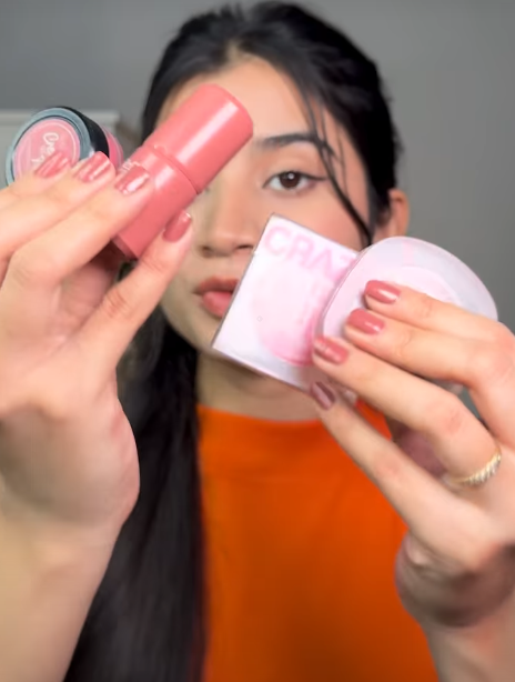 A person is holding soft pink beauty products—likely a lip product and a compact—toward the camera, highlighting a coordinated, natural-glam makeup look. The close-up framing and matching nail color enhance the aesthetic, making it ideal for beauty tutorials, product reviews, or cosmetic promotions.